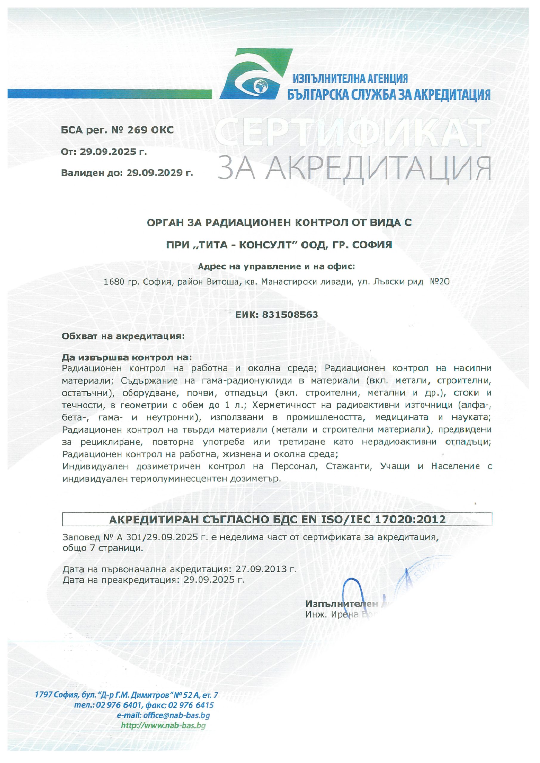 Първоначалната акредитация на Органа за радиационен контрол от вида С на Тита-Консулт ООД е извършена през 2013 г., съгласно БДС EN ISO/IEC 17020:2005, от ИА БСА.
